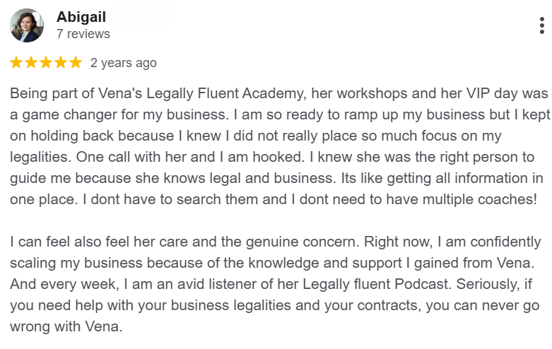 I attended a lot of webinars to help me set up my business correctly. I spent so much time doing research, but it was difficult... Nothing came close to the value and guidance Vena provides to her attendees. I was so afraid of doing it on my own because I am an expat. This masterclass gave me the confidence to finally register my business and comply with the legal requirements for my website. It saved so much time and my sanity.