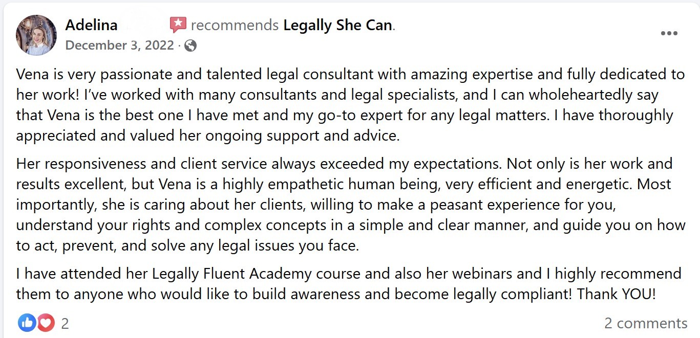 Legally She Can GmbH is a legal consultancy, not a law firm. Vena Verga-Danemar is a licensed lawyer turned legal and business strategist. When you interact with her through Legally She Can or any of our social media platforms, she is NOT acting as your lawyer, nor does this interaction establish a lawyer-client relationship. The information provided by Legally She Can and Vena Verga-Danemar is not legal advice, but strategic legal guidance designed to help coaches, experts and online business owners navigate compliance, protect their work, and operate with confidence. This is not intended to be attorney advertising.