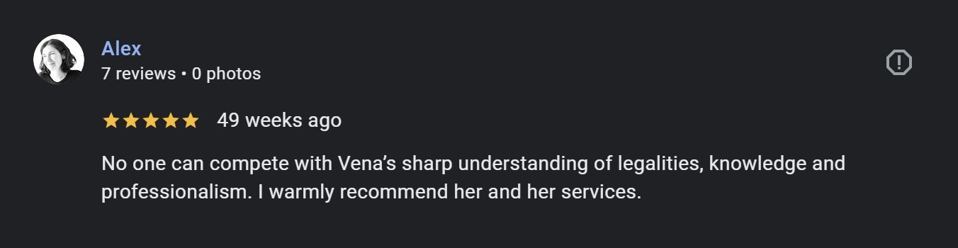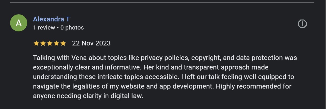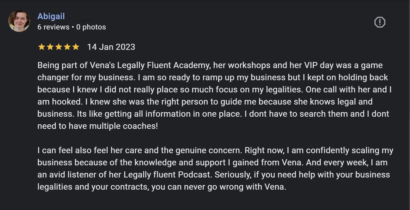 I attended a lot of webinars to help me set up my business correctly. I spent so much time doing research, but it was difficult... Nothing came close to the value and guidance Vena provides to her attendees. I was so afraid of doing it on my own because I am an expat. This masterclass gave me the confidence to finally register my business and comply with the legal requirements for my website. It saved so much time and my sanity.