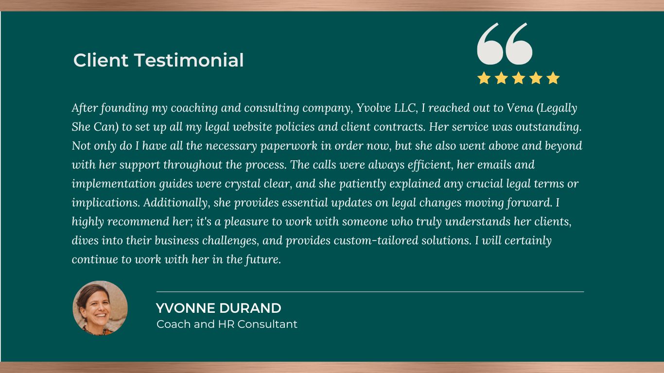Legally She Can GmbH is a legal consultancy, not a law firm. Vena Verga-Danemar is a licensed lawyer turned legal and business strategist. When you interact with her through Legally She Can or any of our social media platforms, she is NOT acting as your lawyer, nor does this interaction establish a lawyer-client relationship. The information provided by Legally She Can and Vena Verga-Danemar is not legal advice, but strategic legal guidance designed to help coaches, experts and online business owners navigate compliance, protect their work, and operate with confidence. This is not intended to be attorney advertising.
