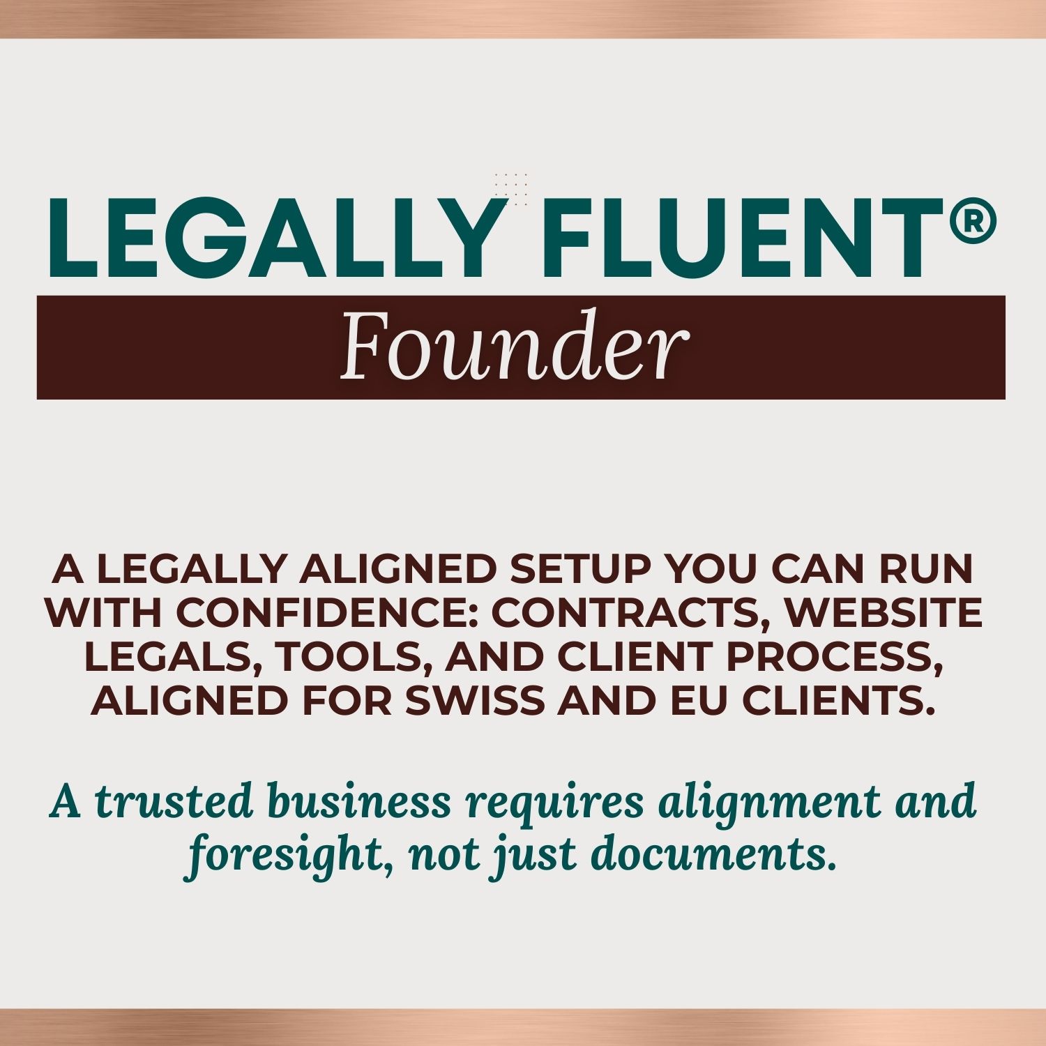 Legally Fluent Founder is a guided legal-business alignment program for founders working with Swiss and EU clients who want to move forward without guessing, patching, or fixing things later.